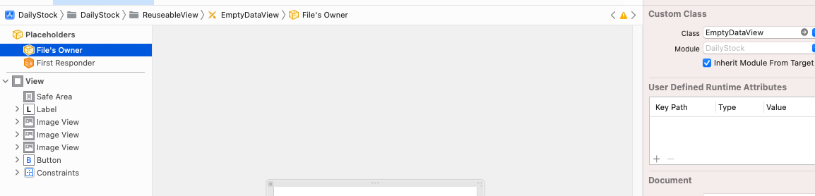여기서 중요한 점은 File's Owner 에 CustomView Swift 파일을 지정해주고 View에 대한 Class 는 지정해주지 않는다.