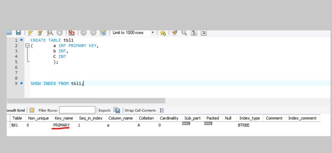 a 열 에 key_name이 PRIMARY 로 된 클러스터형 인덱스를 의미한다.